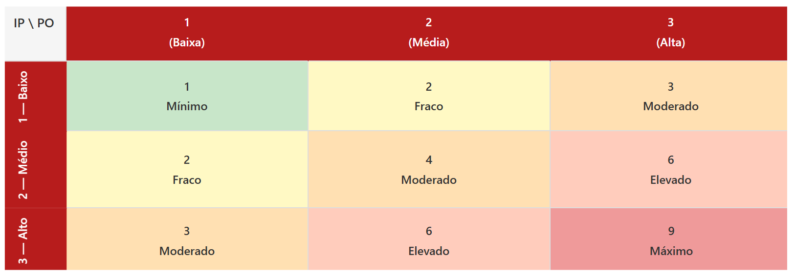 • Fraco (2): Risco baixo, aceite com controlos básicos.